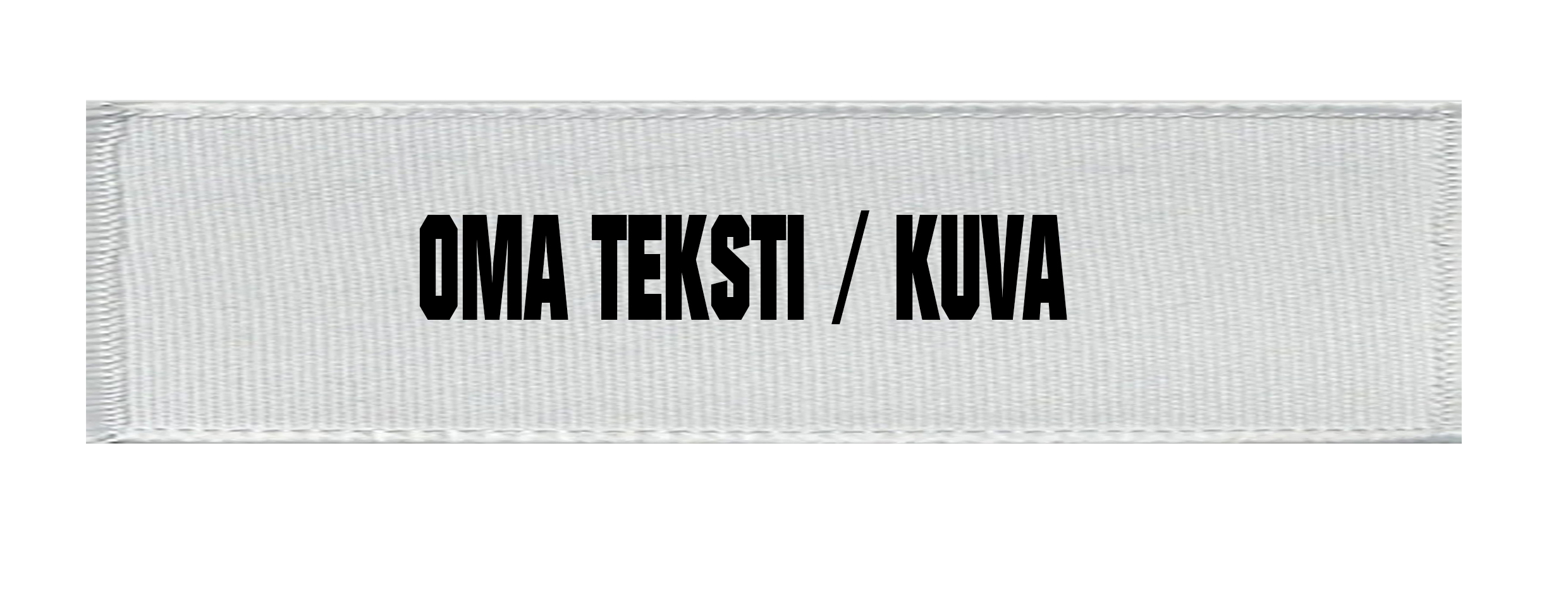 Kangasmerkki 2,5×10 cm, omalla kuvalla / textillä. Valkea tikkireunus. Materiaali: Polyesteri